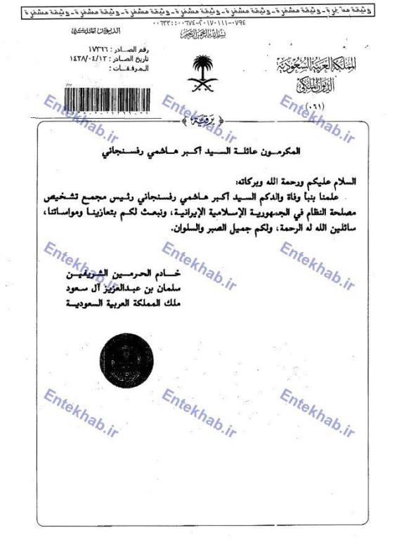 خرداد: در حالیکه شماری از رسانه های اصولگرا مدعی شده اند که پادشاه عربستان دو هفته بعد از فوت آیت الله هاشمی و بر اساس برخی اصرارها پیام تسلیت به خانواده هاشمی را ارسال کرده است، تاریخ انتشار این پیام نشان می دهد که پیام تسلیت در همان روزهای ابتدایی صادر شده است.