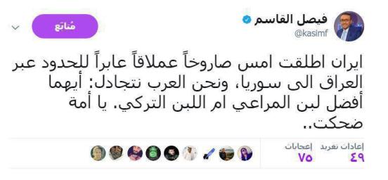 به گزارش خرداد؛ فیصل قاسم مجری مشهور الجزیره در پی حمله موشکی ایران به مواضع داعش در سوریه در قالب توئیتی نوشت: «موشکهای دوربرد ایران درحالی با عبور از عراق به سوریه رسید که ما عربها درحال دعوا بر سر این مسئله هستیم که دوغ طبیعی خوشمزهتر است یا دوغ ترکیه ای؟ امت عربی مسخره دیگران شده است.»