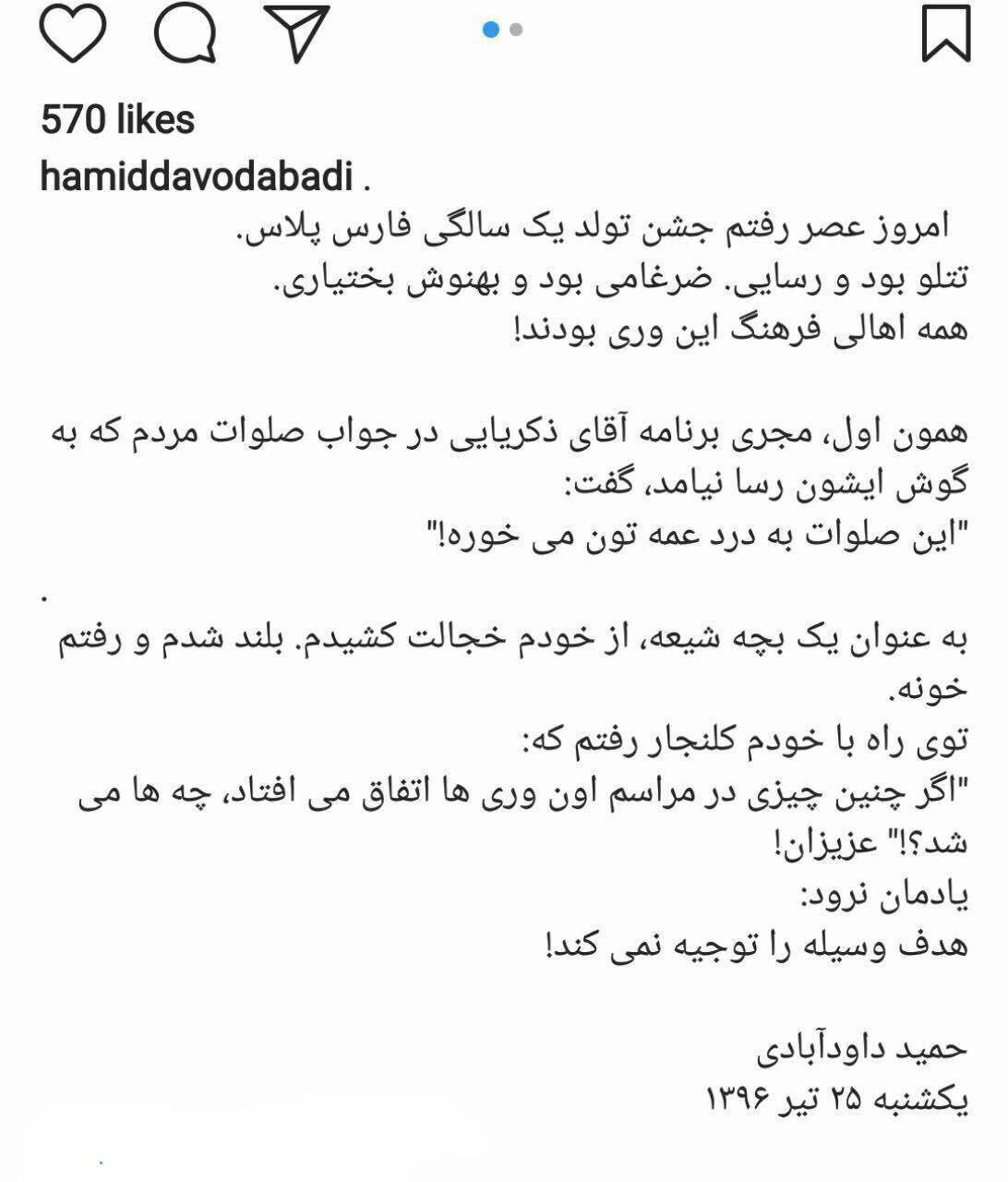 خرداد:حمید داودآبادی، نویسنده و فعال ادبی اصولگرا: بعنوان یک بچه شیعه خجالت کشیدم و جشن خبرگزاری فارس را ترک کردم .