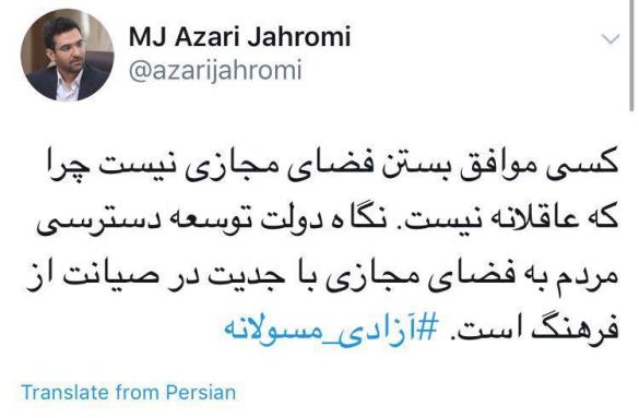 خرداد: محمد جواد آذری جهرمی در توئیت تازه خود از استراتژی دولت دوازدهم در خصوص مجازی گفته است. به گزارش خرداد؛ جوان ترین وزیر دولت دوازدهم که حضور پر رنگی طی این چند روز در توئیتر فیلتر شده دارد، نوشت: