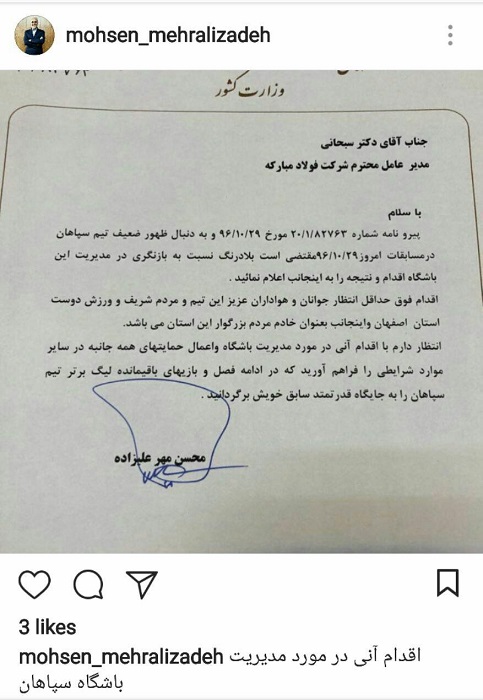 به گزارش به نقل از ورزش سه، محسن مهرعلیزاده استاندار اصفهان پس از شکست سپاهان در دربی اقدام به انتشار نامه ای رسمی و درخواست برای ایجاد تغییرات در باشگاه کرد، اما به صورت صریح از اقدامات مورد نظرش حرفی نزده بود.