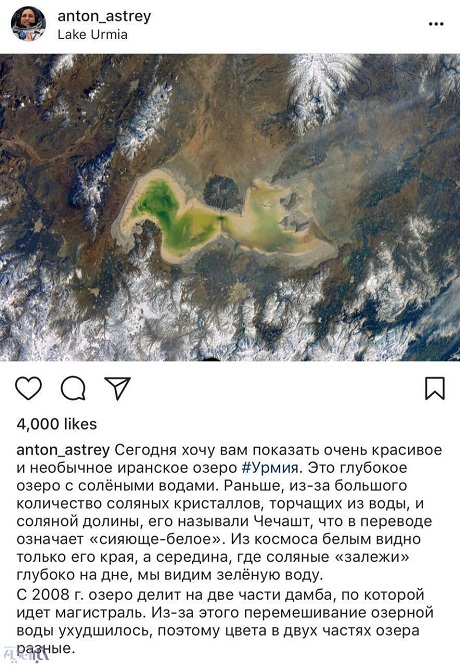 خرداد: آنتون آستری فضانورد روسی و خلبان جنگنده سابق نیروی هوایی روسیه تصویری هوایی از آخرین وضعیت دریاچه ارومیه منتشر کرده است.