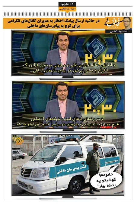 خرداد: در حاشیه ارسال پیامک اخطار به مدیران کانالهای تلگرامی برای کوچ به پیامرسانهای داخلی، احمدرضا کاظمی این فتوطنز را در روزنامه قانون منتشرکرد.