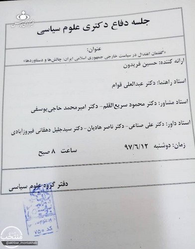 به گزارش ایرنا، قرار بود دفاع «حسین فریدون» با عنوان «گفتمان اعتدال در سیاست خارجی جمهوری اسلامی ایران؛ چالش ها و دستاوردها» به راهنمایی دکتر «عبدالعلی قوام»، مشاوره دکتر «محمود سریع القلم» و دکتر« امیر محمد حاجی یوسفی» داوری اساتید «علی صناعی» ، «ناصر هادیان» و «سید جلیل دهقانی فیروز آبادی» در دفتر گروه علوم سیاسی دانشگاه شهید بهشتی برگزار شود؛ جلسه ای که به گفته یکی از اساتید گروه علوم سیاسی به دلیل افزایش ضربان قلب دکتر هادیان به 180 معلق و تا اطلاع ثانوی لغو شد.