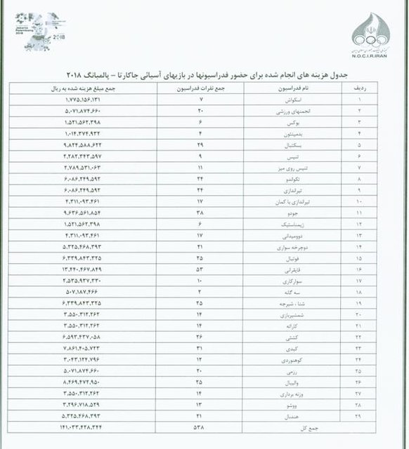 counter create hit اعلام هزینه کمیته المپیک برای فدراسیون های اعزامی به بازیهای آسیایی جاکارتا + جدول