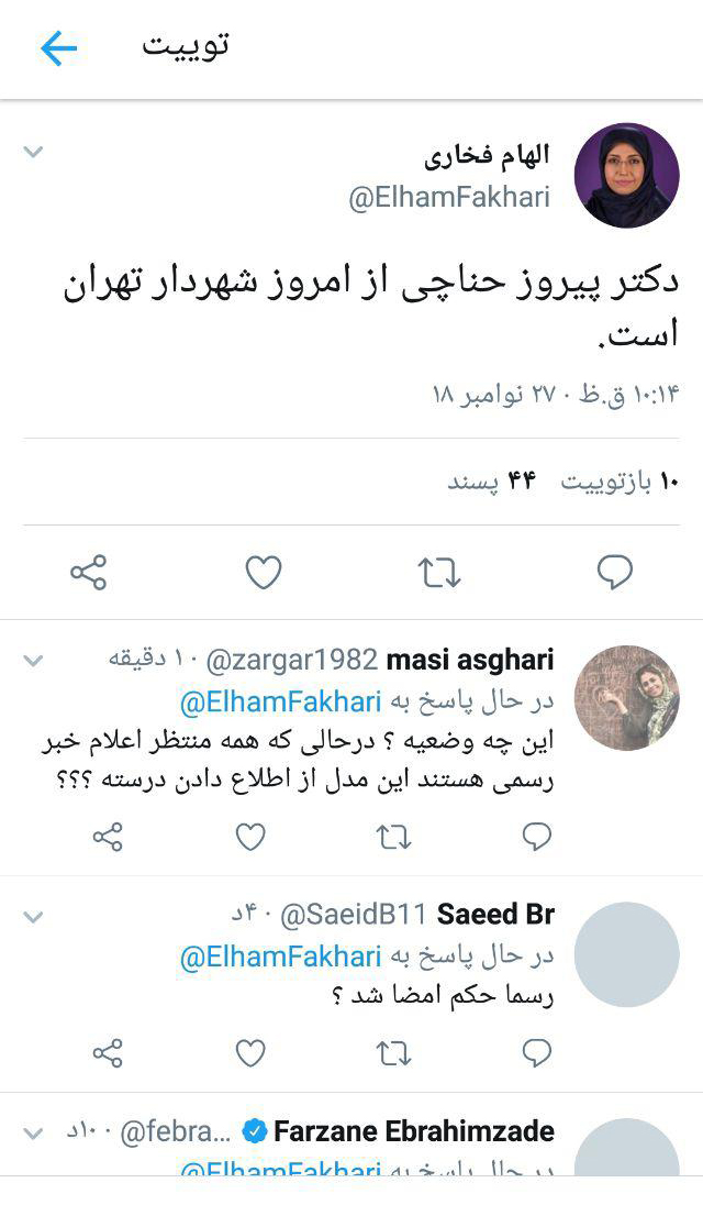 الهام فخاری دیگر عضو شورا نیز در میانه جلسه ناگهان توئیت زد که «از امروز پیروز حناچی شهردار تهران است.» این خبر روی خروجی یکی از خبرگزاریها قرار گرفت و لحظهای بعد حذف شد تا همچنان ابهام درباره صدور حکم پیروز حناچی باقی بماند.