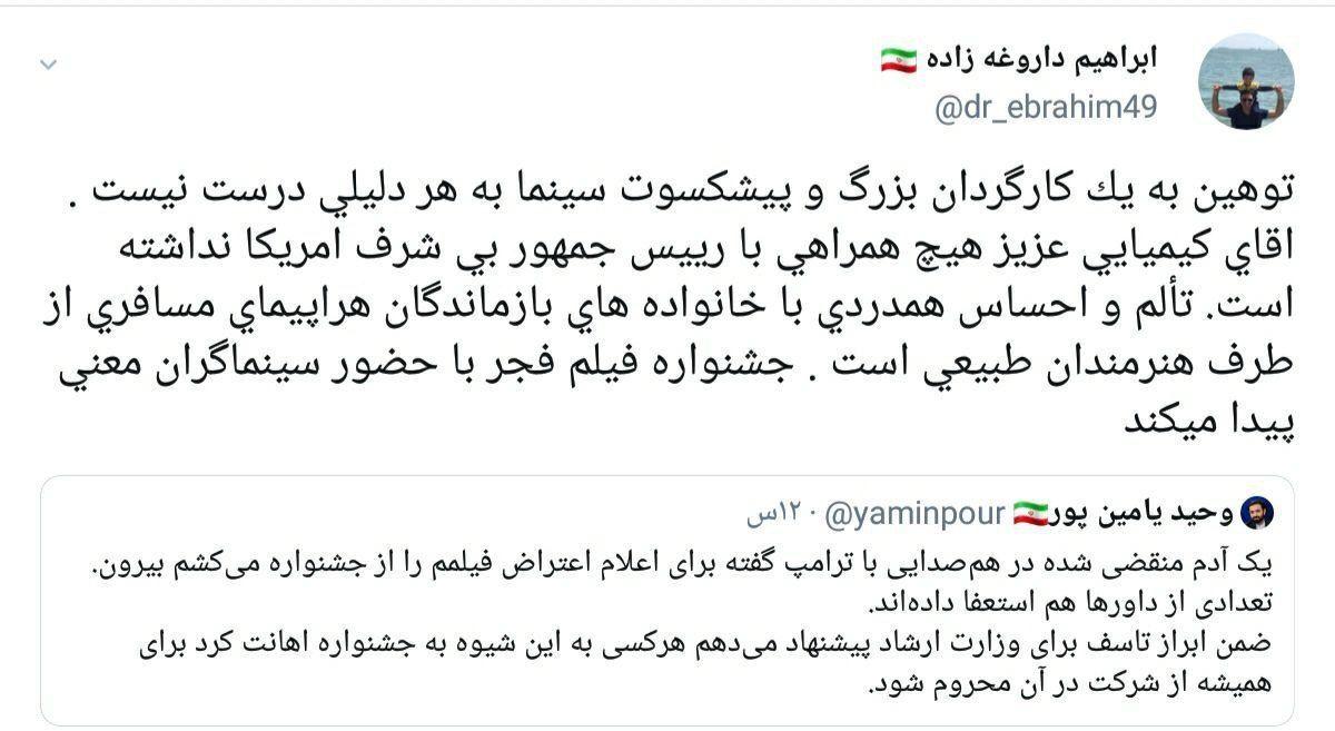 خرداد: پاسخ ابراهیم داروغه زاده دبیر سی و هشتمین جشنواره ملی فیلم فجر به واکنش وحید یامین پور درباره انصراف مسعود کیمیایی از حضور در این رویداد هنری