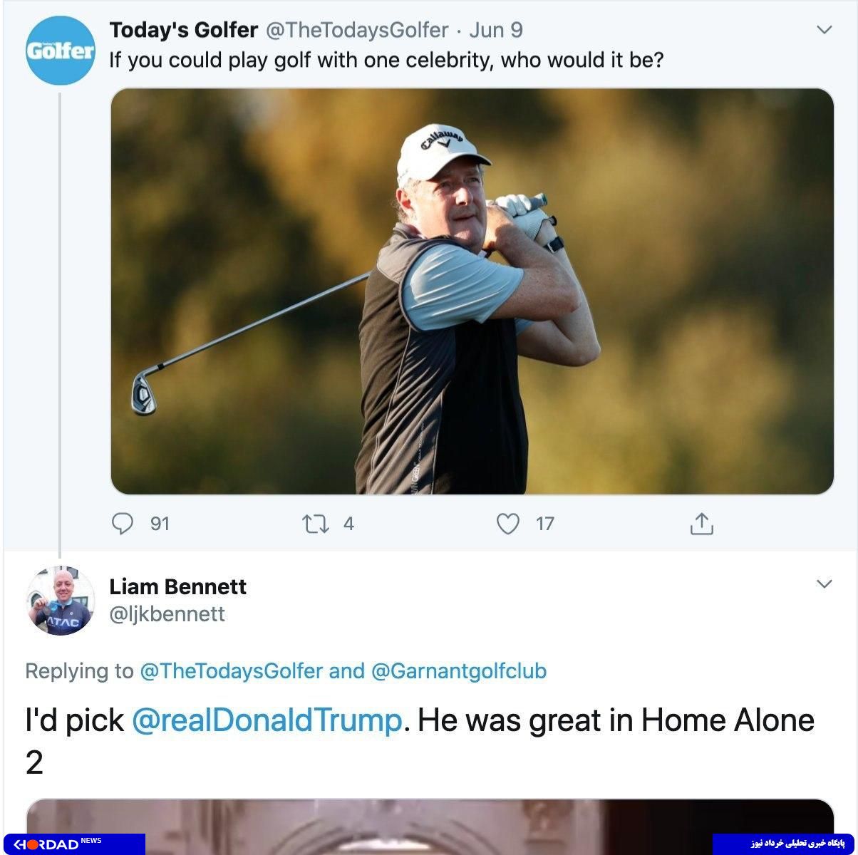 به گزارش سرویس بین الملل خرداد _رامتین لطیفی :چند روز پیش یک رسانه انگلیسی به نام "تودی گلفر” که اولین و بهترین رسانه تخصصی ورزش گلف در بریتانیاست در حساب رسمی توییتر خود پستی منتشر کرد که در آن از طرفداران ورزش گلف پرسیده بود "اگر بتوانید با یک سلبریتی گلف بازی کنید، دوست دارید آن سلبریتی چه کسی باشد؟”.