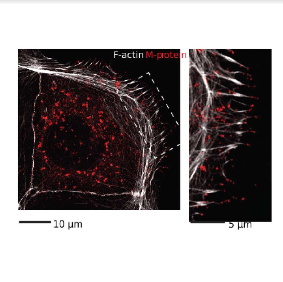 تصاویر میکروسکوپ فلورسانس از سلولهای اپیتلیایی (پوششی) روده بزرگ انسان که با ویروس جدید کرونا آلوده شدهاند. سلولهای آلوده شاخکهایی (فیلوپودیا) تولید میکننند که از سطح سلول خارج میشوند و حاوی ذرات ویروس (پروتئین M به رنگ قرمز) هستند.