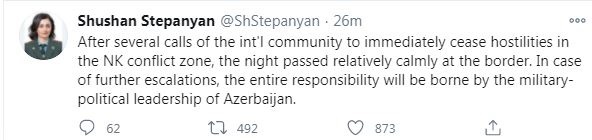 به گزارش خرداد فارس نوشت: وی در این پیام تصریح کرد که «بعد از چندین درخواست جامعه بین‌الملل برای آتش‌بس فوری در منطقه مورد مناقشه ناگورنو-قره باغ (قره باغ کوهستانی)، شب نسبتاً آرامی در مرز داشتیم. در صورت تنش‌های بیشتر، کل مسئولیت برعهده رهبری نظامی-سیاسی (جمهوری) آذربایجان خواهد بود».