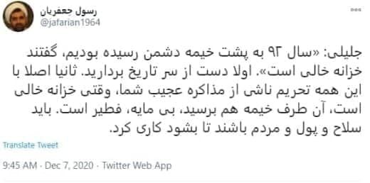 خرداد: رسول جعفریان، پژوهشگر و استاد تاریخ دانشگاه تهران در پاسخ به اظهارات اخیر سعید جلیلی نوشت: