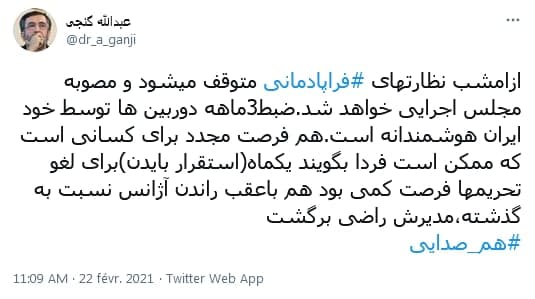 عبدالله گنجی در حساب کاربری خود در توییتر در واکنش به بیانیه مشترک ایران و آژانس و ازامشب نظارتهای فراپادمانی تصمیم گرفته شده در این خصوص نوشت: از امشب نظارتهای فراپادمانی متوقف میشود و مصوبه مجلس اجرایی خواهد شد.