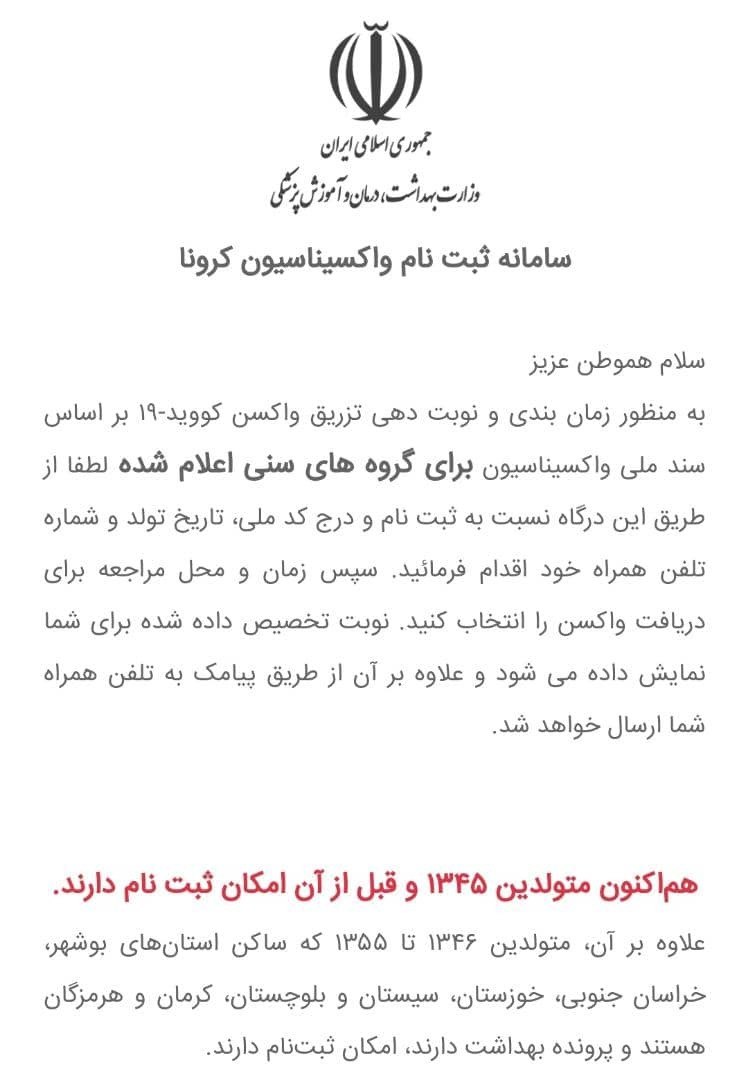 متولدین سال ۱۳۴۵ و قبل آن میتوانند با مراجعه به سایت salamat.gov.ir و انتخاب استان و ثبت اطلاعات لازم نسبت به ثبت نام اقدام کنند و در نوبت دریافت واکسن کرونا قرار گیرند.