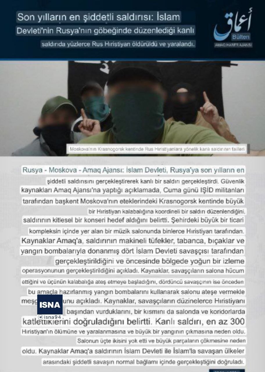 بیانیه جدید داعش درباره حمله شب گذشته به سالن کنسرت کروکوس روسیه: در حمله به مسکو ۴ نفر مسلح به مسلسل، تفنگ، چاقو و بمبهای آتشزا بودند. قبل از این حمله یک ماموریت شناسایی «هماهنگ» هم صورت گرفته است. داعش به این که کدام یک از شاخههای منطقهای این گروه تروریستی مسبب این حمله بوده اشارهای نکرده است./ایسنا