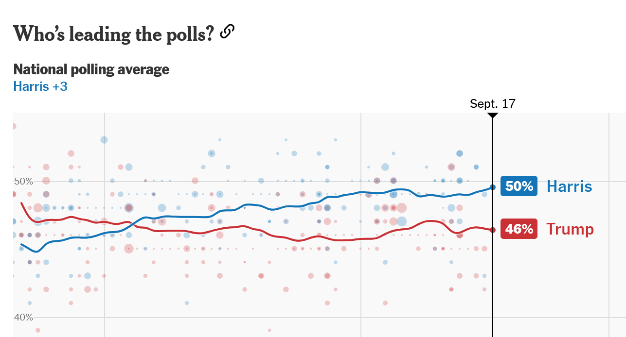 آخرین نظرسنجی رسمی منتشر شده در روزنامه معتبر نیویورک تایمز نشان میدهد که کامالا هریس تا این لحظه شانس پیروزی بیشتری نسبت به ترامپ دارد. براساس این گزارش، هریس در تاریخ 17 سپتامبر 2024 با حمایت 50 درصدی (4 درصد بیشتر از ترامپ) از رقیب خود پیشی گرفته است. از طرفی، اکثر رایدهندگان آمریکایی بر این باور هستند که پیروز مناظره اخیر، کاملا هریس بوده است، زیرا به خوبی توانسته است از پس سوالات سخت مالی و پاسخ به ترامپ بر بیاید. بااینحال، تصمیمگیری درباره این انتخابات و تاثیر آن روی قیمت محصولات فولادی و بازار آهن آلات هنوز زودهنگام است و باید منتظر ماند و نظرسنجیهای جدیدتر را بررسی کرد.