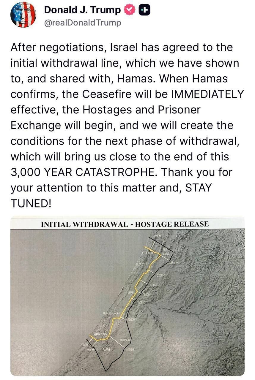 ترامپ نوشت: «پس از مذاکرات، اسرائیل با خط اولیه عقب‌نشینی موافقت کرده است، که ما آن را به حماس نشان داده و با آن به اشتراک گذاشته‌ایم.»