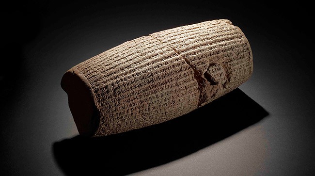 استوانه کوروش بزرگ، این استوانه به عنوان نخستین بیانیه حقوق بشر شناخته می‌شود.